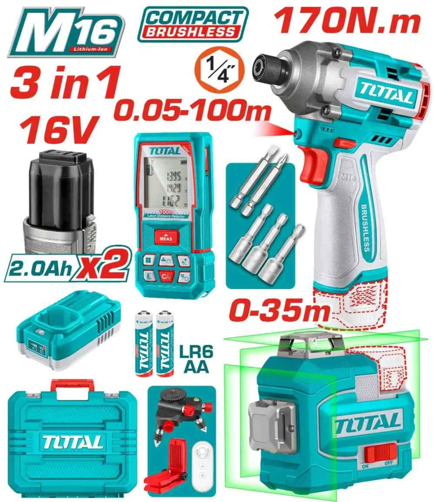 كومبو بطارية 16 فولت (دريل 170 نيوتن + ميزان ليزر + متر ليزر 100 متر ) مع 2 بطارية و شاحن توتال TOSLI250886