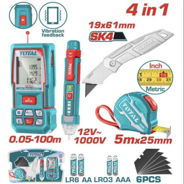 عرض متر ليزر 100 متر + كاشف تيار + قطر مطواه معدن + شريط 5×25 اتجاهيين توتال TOS250701