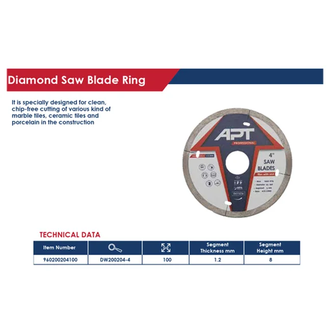 Model: APT DW200204-4Diameter: 100 mm (4 inches), designed for use with a mini angle grinder.Edge Type: Continuous Rim (a smooth, continuous edge), which gives it the nickname “biscuit” because it cuts exceptionally smoothly without leaving burrs.