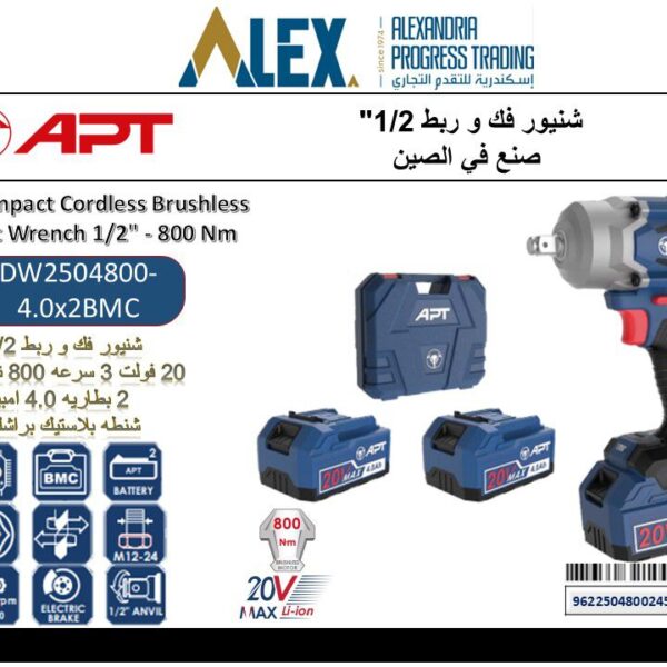 دريل فك وربط 20 فولت 1/2 800 نيوتن/متر 2 بطارية 4 امبير + شاحن APT DW2504800-4.0*2BMC