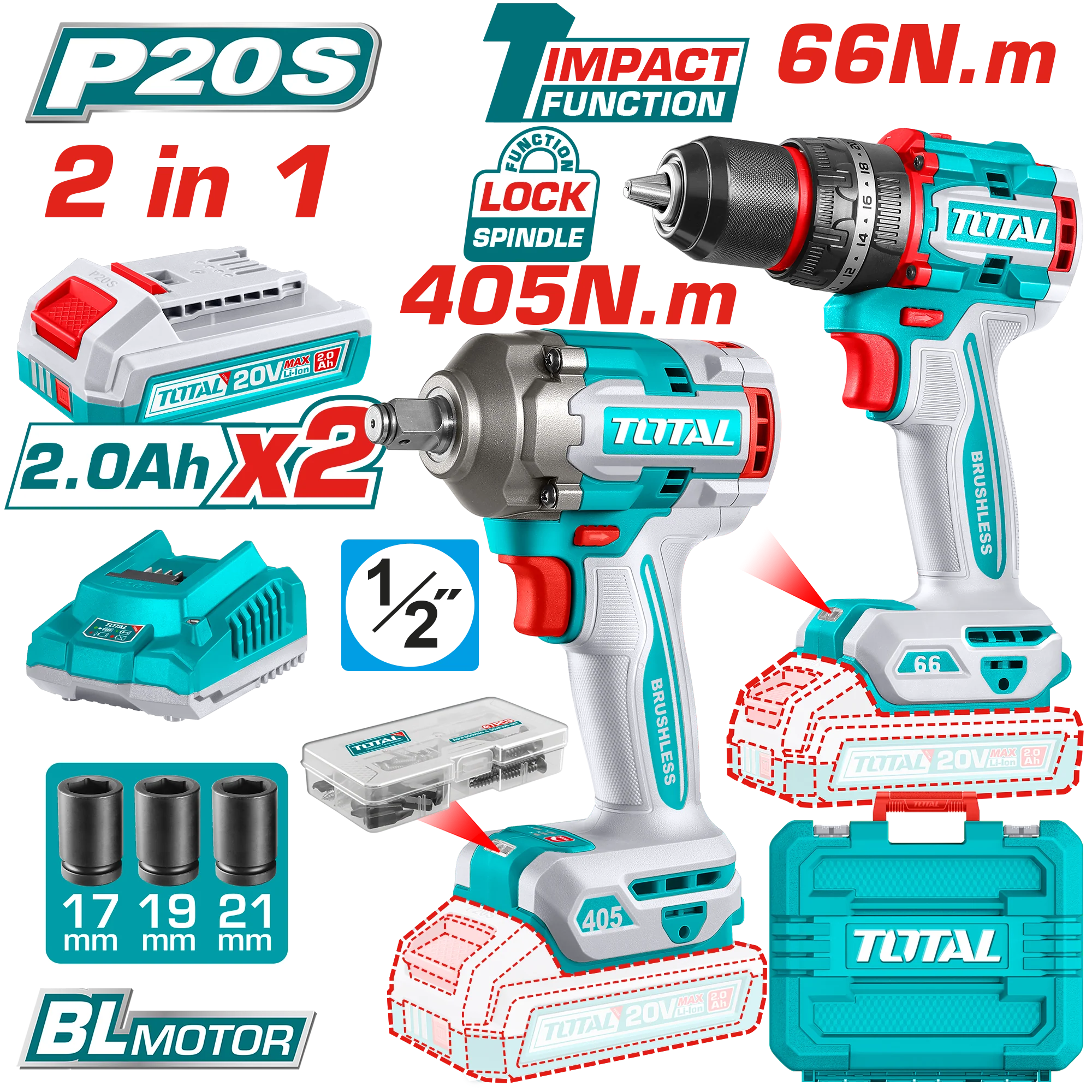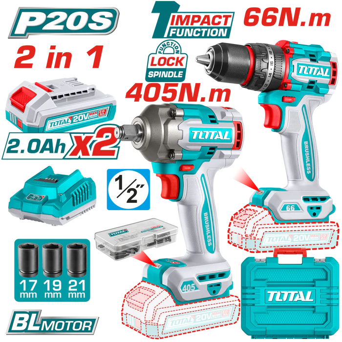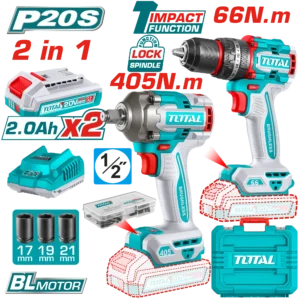 كومبو شنيور 66 نيوتن دقاق + دريل 405 نيوتن + 2 بطاريه و شاحن توتال TCKLI20286