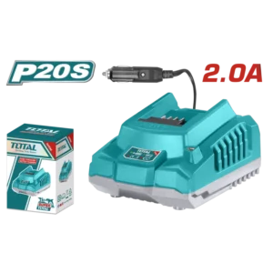 The TOTAL P20S Lithium-Ion Car Battery Charger is a versatile and reliable solution for charging your P20S series batteries while on the move. Designed for convenience and efficiency, this charger is powered directly from a 12–24V DC vehicle outlet, making it ideal for use in cars, trucks, and at outdoor job sites. Its compact and durable design ensures it can withstand the rigors of daily use, providing a dependable charging experience wherever you go. This charger delivers a 20V output with a 2.0A current, ensuring fast and efficient charging of your batteries. The design incorporates cooling vents to prevent overheating, enhancing the charger’s lifespan and ensuring safe operation. The charger is compatible with all P20S Li-ion batteries, making it a versatile addition to your toolkit. Whether you’re a professional tradesperson or a DIY enthusiast, this charger provides a convenient way to keep your batteries powered up and ready for action. The TOTAL P20S charger is engineered for ease of use. Simply plug it into your vehicle’s power outlet, connect it to your P20S battery, and let it do the work. The charger’s robust construction and reliable performance make it a valuable asset for anyone who relies on P20S batteries. The charger’s compact size means it won’t take up much space in your vehicle, and its durable design ensures it can withstand the bumps and jostles of travel. The charger is packed in a color box, making it easy to store and transport. With its efficient charging capabilities and durable design, the TOTAL P20S Lithium-Ion Car Battery Charger is an essential accessory for anyone using P20S series batteries. It provides a dependable power source, ensuring your tools are always ready when you need them. The charger’s compatibility with all P20S Li-ion batteries makes it a versatile and practical choice for a wide range of users.