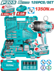 دريل بطارية برشليس 20 فولت 1350 نيوتن 3/4 بوصة مع بطارية و شاحن و طقم عدة , 126 قطعة توتال تولز THKTHP31262