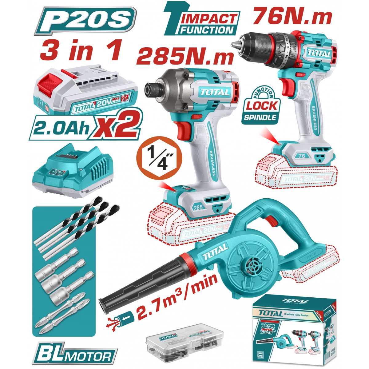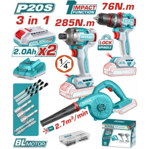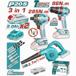 TOTAL TOOLS 20V Cordless 3-in-1 Combo Kit (Impact Drill + Blower + 1/4″ Impact driver ) with 2 Batteries and Charger – TOSLI250883